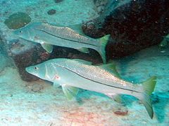 This is another coastal species that often enters estuaries and freshwater environments. Adult mullet have been found in waters ranging from 0 ppt to 75 ppt salinity while juveniles can only tolerate such wide salinity ranges after they reach lengths of 1.6-2.8 inches (4-7 cm). Adults form huge schools near the surface over sandy or muddy bottoms and dense vegetation.